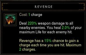 复仇:触发技能。对周围所有敌人造成220%武器伤害,每击中一个敌人,回复2%生命。每次被击中都有15%的击回触发复仇,最多可同时触发叠加2次。