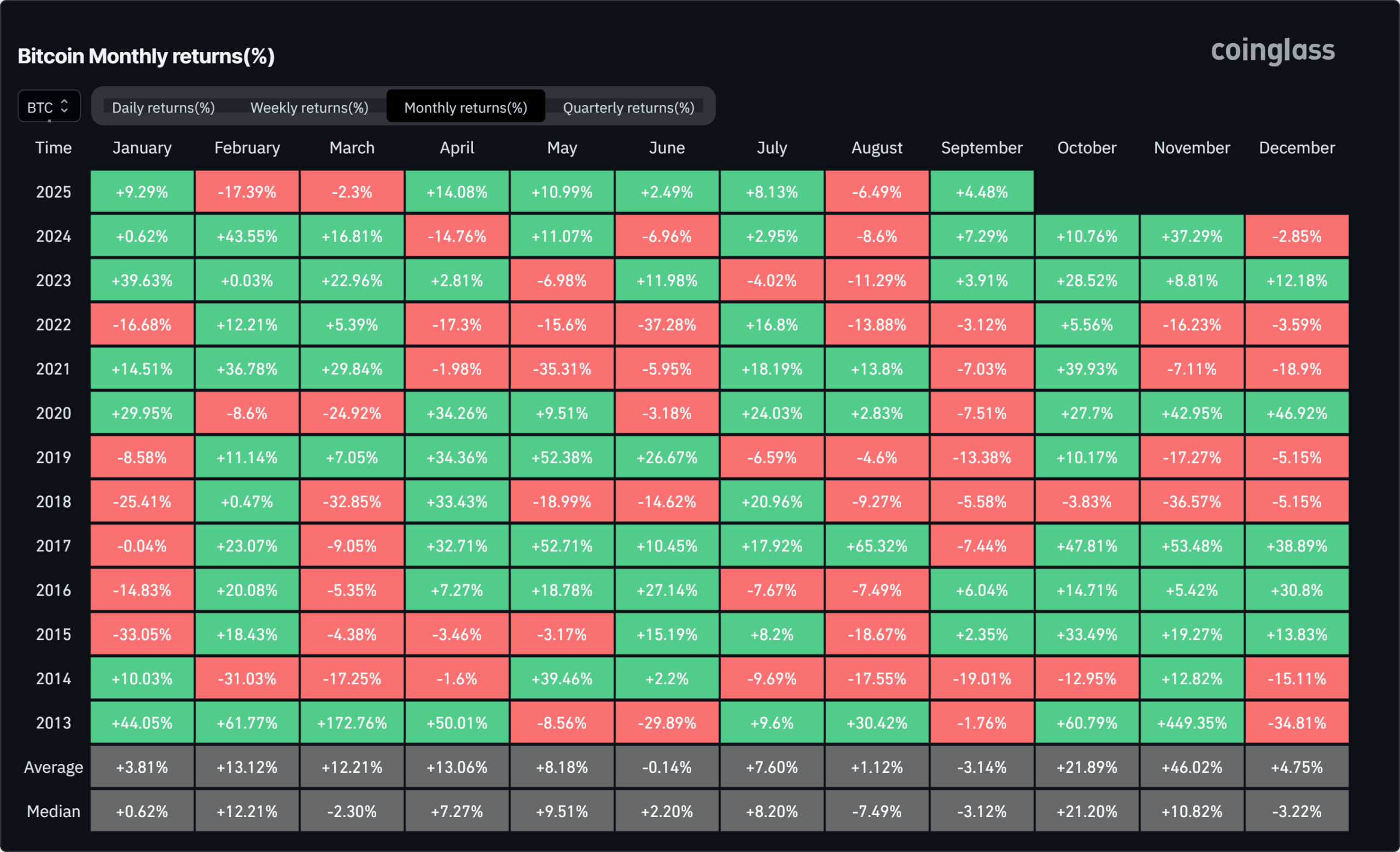 CoinGlass数据显示,比特币十月平均涨幅达21.89%,成为仅次于11月的年度表现第二佳月份。过去六年十月BTC均以阳线收盘,其中五年实现两位数涨幅。