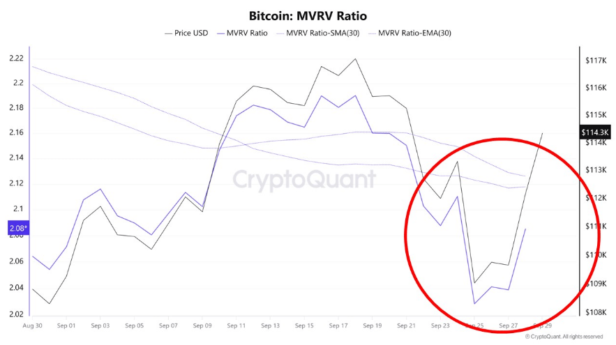 与此同时,交易所储备大幅下降,代币正从交易所转入长期存储。分析显示,此前下跌期间走低的MVRV比率(市值/实现价值)开始回升。