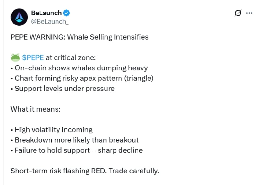 鲸鱼抛售激增、三角形态接近顶点、支撑转弱——高波动性与破位风险加剧。来源:BeLaunch via X