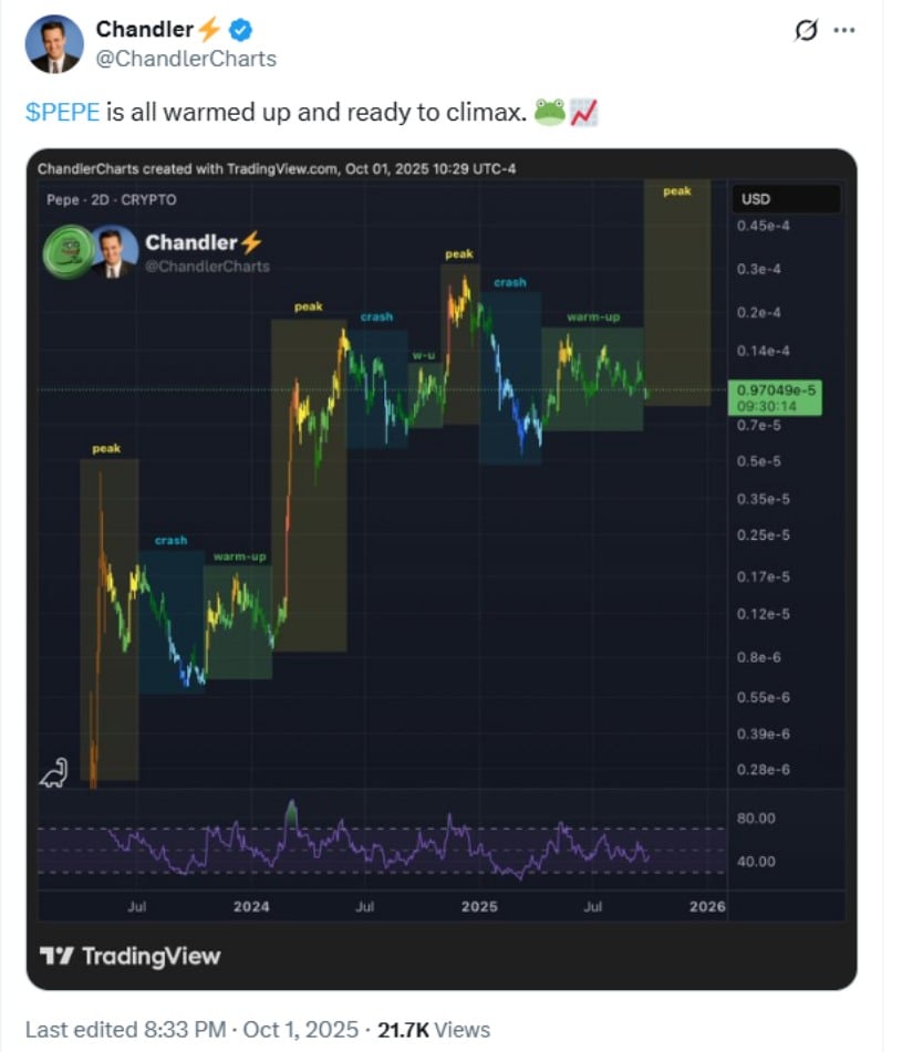 图表分析师意见分歧。部分人士将对称三角视为看涨中继形态,类比2024年Pepe在类似盘整后暴涨200%的走势。分析师Chandler称该代币"热身完毕准备冲刺",暗示Pepe价格预测模型显示新一轮上涨潜力。