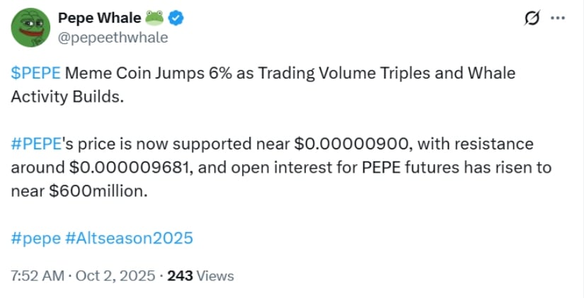PEPE单日暴涨6%,成交量翻三倍伴随鲸鱼活动激增,0.00000900美元形成支撑,期货未平仓合约逼近6亿美元。来源:Pepe Whale via X