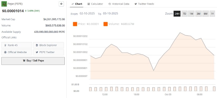 截至发稿,Pepe报价0.00001014美元,24小时涨幅3.40%。来源:Brave New Coin