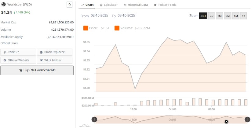 数据显示Worldcoin现报1.34美元,24小时涨幅1.10%。项目市值维持28.9亿美元,日交易量达2.813亿美元,显示市场参与度稳定。