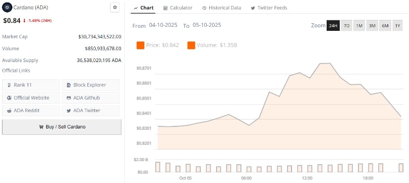 卡尔达诺现价0.84美元,24小时跌幅1.48%。数据来源:Brave New Coin
