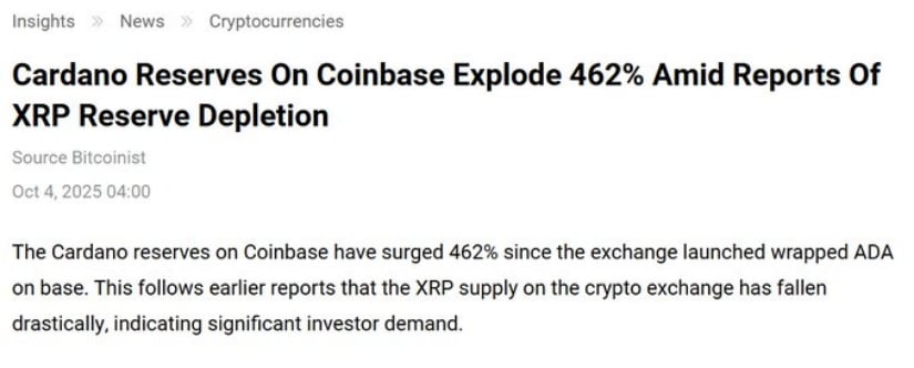 Coinbase的ADA储备激增462%至956万枚,显示机构强力吸筹。数据来源:Mintern via X