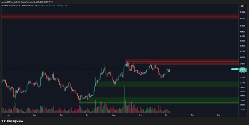 分析师CW8900指出1.02美元是"真正行情"的启动信号位,该价位与三季度压制ADA上行的历史阻力区重合。突破该区域将打开1.30-1.50美元的上行空间,而0.80和0.75美元仍是稳固支撑。