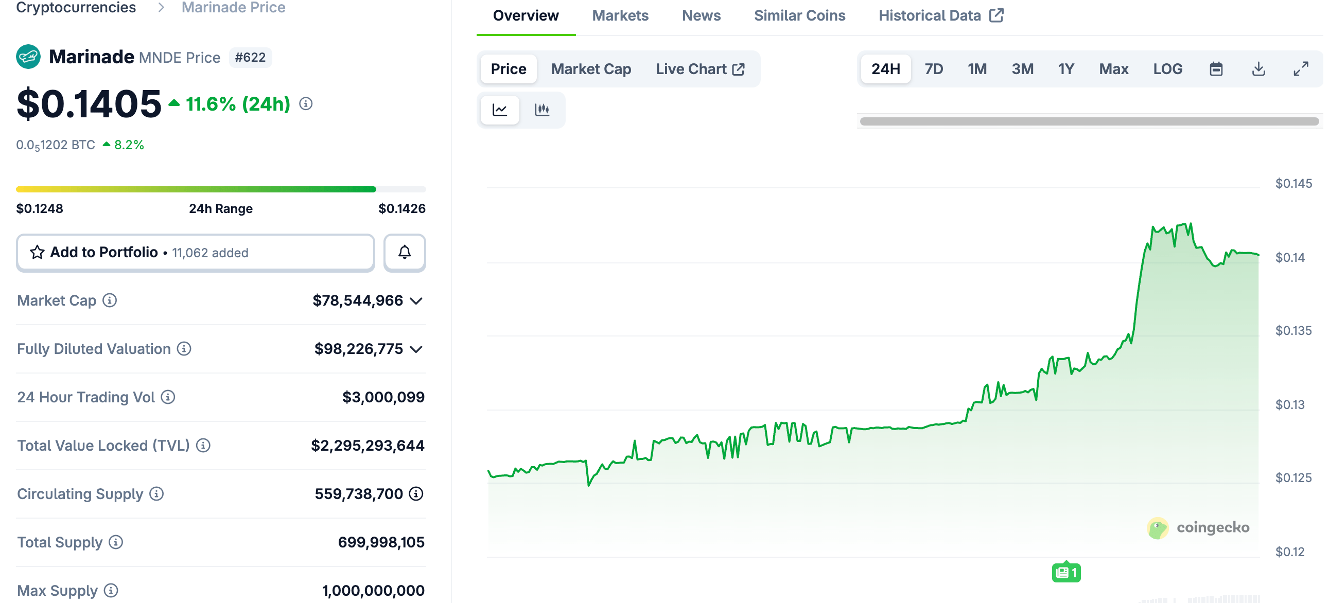 另一方面,DeFi协议Marinade Finance当前持有超1040万枚SOL代币,按市价计算约合22亿美元。CoinGecko数据显示,该协议原生代币MNDE过去24小时上涨11.6%,现报0.14美元。