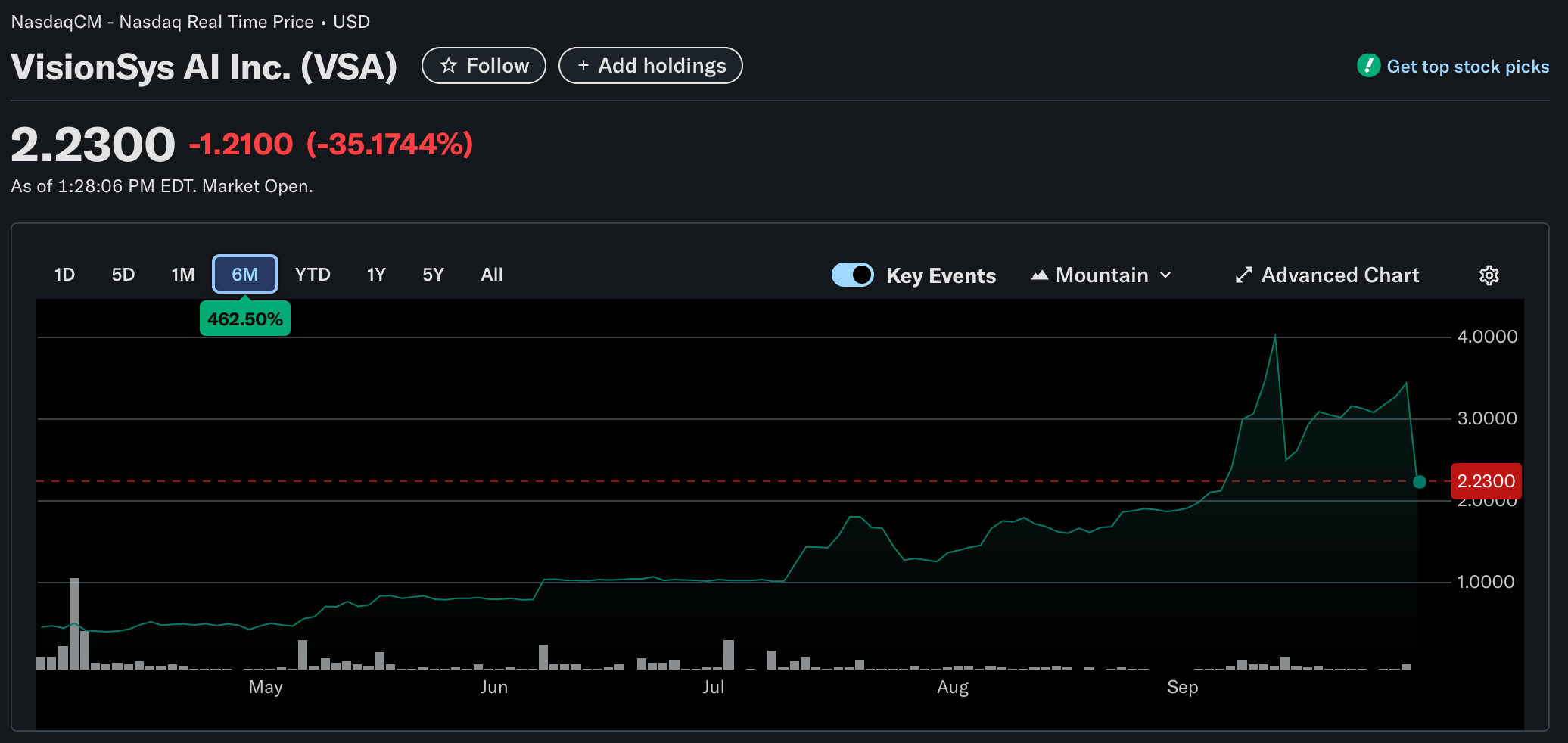 然而VisionSys AI股价在公告发布后暴跌,过去24小时重挫35.17%,现报2.23美元。但该股近六个月仍累计上涨462%。