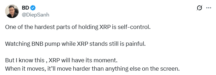 针对BNB近期的上涨行情,XRP社区专家Diep Sanh指出,持有XRP最考验投资者的自控力——当其他资产暴涨时,XRP往往滞后,这容易引发抛售冲动。