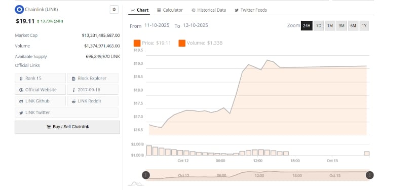 本周稍早经历闪跌后,Chainlink呈现强势反弹,单日交易时段内从13美元附近迅速回升至19.11美元。13.73%的涨幅创下该代币近周最迅猛的回升纪录。数据显示其涨势始于10月12日凌晨,数小时内从16.60美元攀升至19美元上方。