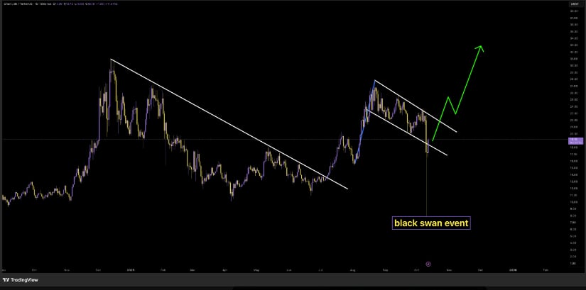 分析师Don将近期暴跌称为"黑天鹅事件",指出其快速反弹消除了看跌压力并重建技术结构。该代币已突破下降阻力通道,形成与看涨形态一致的延续结构。Don预测若维持复苏趋势,价格可能向25-30美元区间迈进。