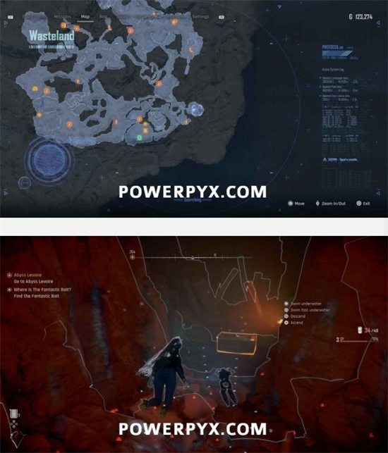 4、以上这些前置条件都完成后,前往废土东南边的水池处(下图所示位置),水下有个洞,游进洞里即可到达水底很深的地方,在水底找到箱子,用刚才的密码【θθθβββ】开启箱子,获得【神奇鱼饵】,返回告示板提交委托即可。
