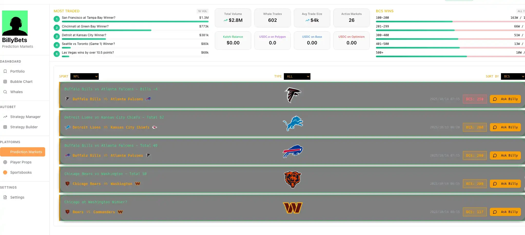 再比如 Billy Bets AI Agent 结合实时数据和机器学习模型,自动发现胜率更高的投注选项并代为执行下单。举个例子,Billy 提供了自然语言交易终端,允许用户输入「今晚 NFL 橄榄球有哪些正 EV 投注?」这类指令,系统会立即返回匹配的盘口并自动下单,同时提供实时 ROI 跟踪。