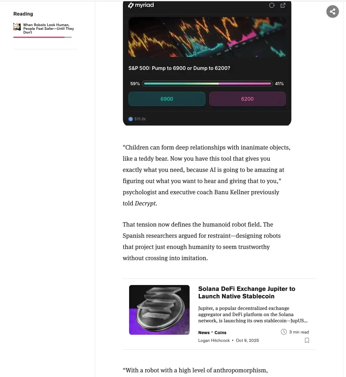 Myriad 是由 Decrypt 母公司 DASTAN 孵化的 Web 3 预测市场协议,其最大特色是在新闻媒体内容中嵌入预测市场。也就是说,当你阅读 Decrypt 的文章或收听 Rug Radio 播客时,可以在页面上直接参与相关主题的预测投票。截至 2025 年 10 月初,Myriad 平台已累计实现约 1850 万美元的 USDC 交易量,交易笔数超过 500 万笔。