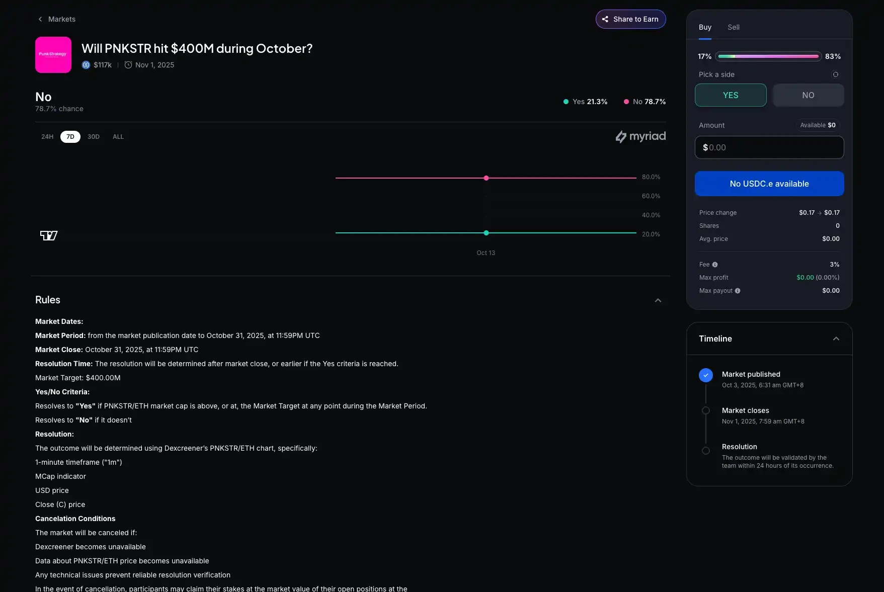 有经验的玩家还会创建低摩擦市场对敲刷量,Myriad 允许用户自定义创建新市场,一些老玩家会扮演「房东」,设立短周期、低争议的小型市场,并自己用 Points 作为初始流动性在买卖两侧挂出深度。比如选取一个简单明了的加密或体育事件(如 PNKSTR 会在 10 月突破 4 亿美元市值吗?)。