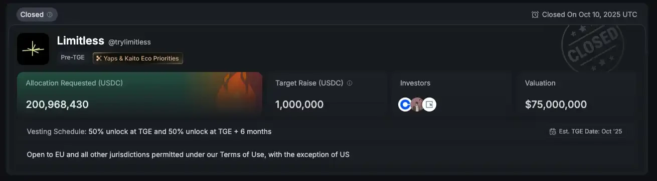 Limitless 已经公布即将发行平台代币 $LMTS,虽然此前遭受过项目方「刷」交易量的质疑,但其资深的投资方依然让市场对其相当热情,国庆期间在 kaito 的预售依旧超募了 200 倍。而第一季作为空投发放依据的积分活动已经结束,目前积分计划已进入第二赛季(2025 年 9 月 22 日开始,持续至 2026 年 1 月 26 日)。在此期间,用户依旧可以通过交易、提供流动性、邀请新人等操作赚取积分。