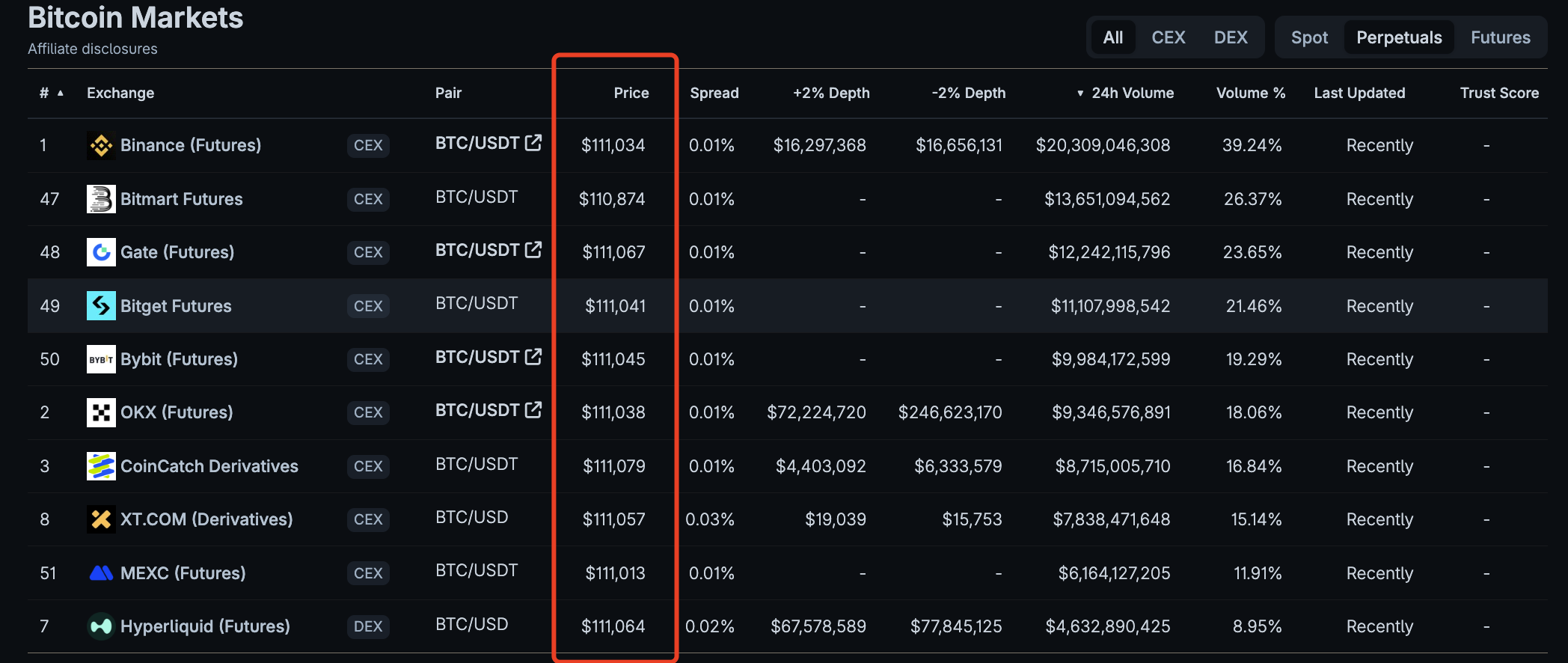 通过上面这张 BTC 的永续合约报价表,你会发现成交量最大的前十名交易所的报价没有一个是一样的。