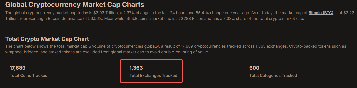 放眼当下,全球被统计在册的加密交易场所动辄上千:仅 CoinGecko 的「全球图表」就显示追蹤 1,300+ 交易所(如下图);而 CoinMarketCap 的现货榜单也长期显示两百余家在活跃报量——这还不含各类衍生品与链上 DEX 的长尾场所。这样的版图,意味着没有谁能天然看到「全市场最优价」。