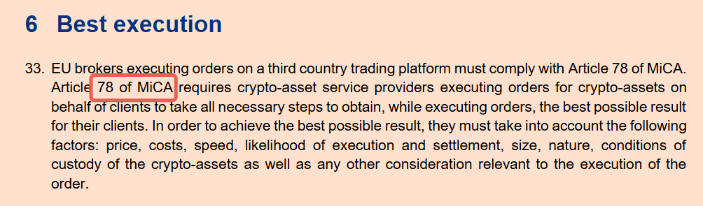 - 原则先行(同一合规圈层): 在单一司法辖区的合规平台 / 经纪 / 聚合器之间,确立「不得穿透更优公开价格 / 净价」的明确义务。什么叫「净价」?不只看萤幕上的名义价,还要把费用、返佣、滑点、Gas、失败重试成本都算进去。欧盟 MiCA 第 78 条 已经把「最佳结果」写成法定清单(价格、成本、速度、执行与结算可能性、规模、託管条件等);这一原则性口径,完全可以成为「加密版防穿透」的锚。(esma.europa.eu, wyden.io)