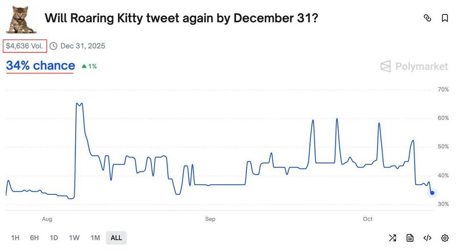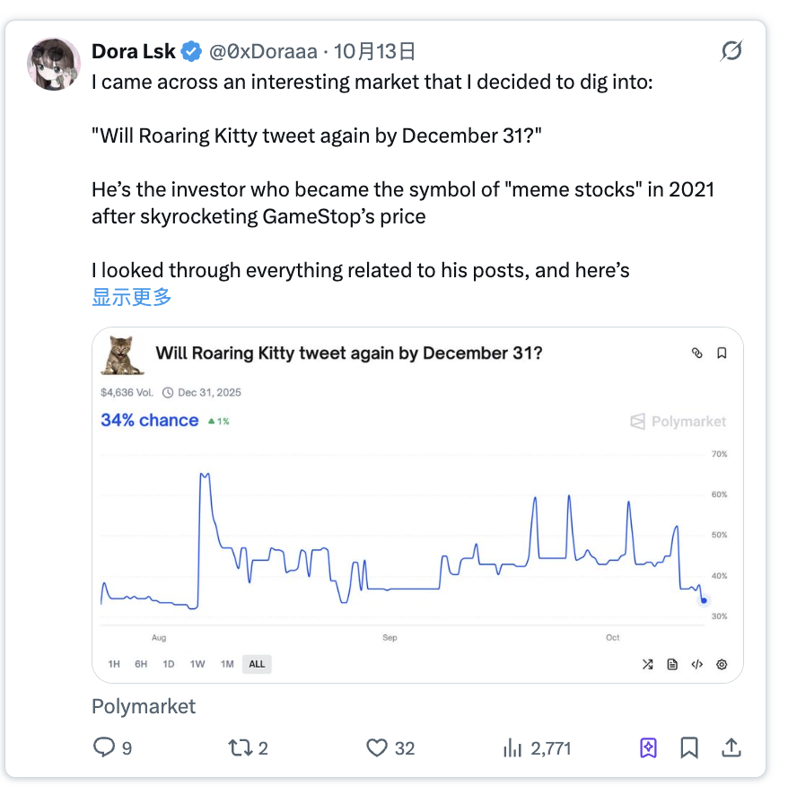 在 Polymarket 上,当我写那篇文章时,该市场的交易量仅为 4636 美元,概率为 34%。