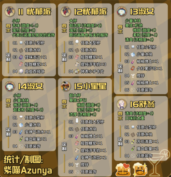 只记录了需要定制调酒的步骤,直接用现有配方调制的没有记录,那种按配方步骤指示来就行。