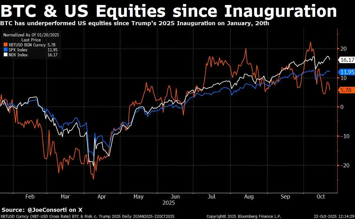 上图显示,自 2025 年川普就职以来,比特币的表现远逊于美国股市。那斯达克和标普 500 指数的涨幅领先比特币超过 100%,而比特币的走势相对平坦。