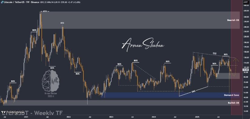 莱特币(LTC)周线趋势维持看涨,从76-88美元需求区反弹至94.5美元,潜在上行目标为100美元、114美元和120美元。来源:TradingView@ArmanShabanTra