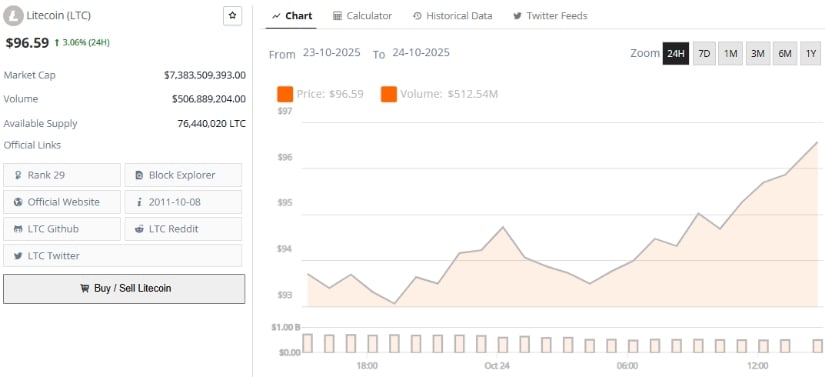 截至发稿时,莱特币报96.59美元,24小时涨幅3.06%。来源:Brave New Coin