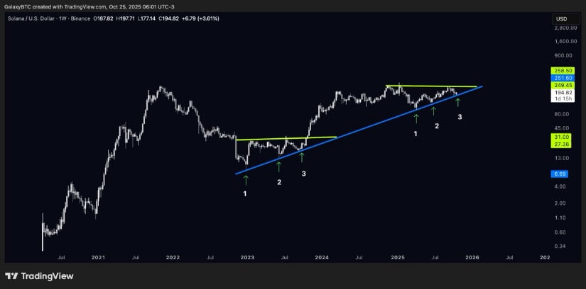 Solana的周线结构持续复刻2023年10月的盘整分形——当时价格经过紧密压缩后垂直突破至新高。Galaxy分享的图表显示,该形态再次形成上升结构,并获上升趋势线三次清晰触碰支撑,暗示表层之下积累的买压正在增强。
