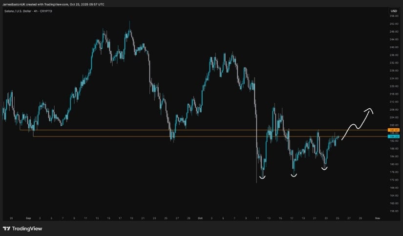 SOL在190美元附近形成倒头肩形态,预示复苏动能及上探210美元潜力。来源:James via X