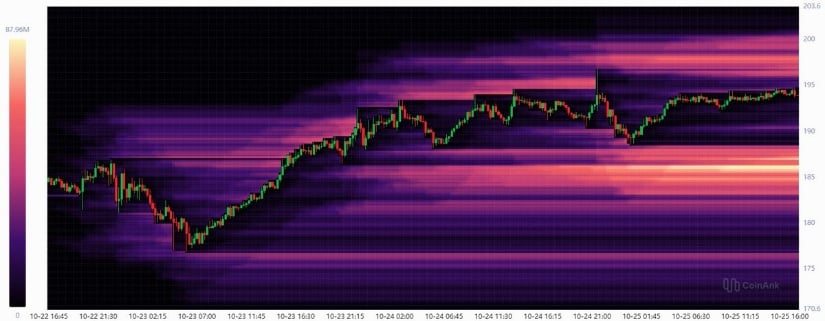 订单簿与清算热图数据显示,若Solana突破200美元将清除大量空头头寸,可能引发连锁清算。该区域与当前区间高点完美重合,一旦突破将大幅增加价格剧烈波动的概率。