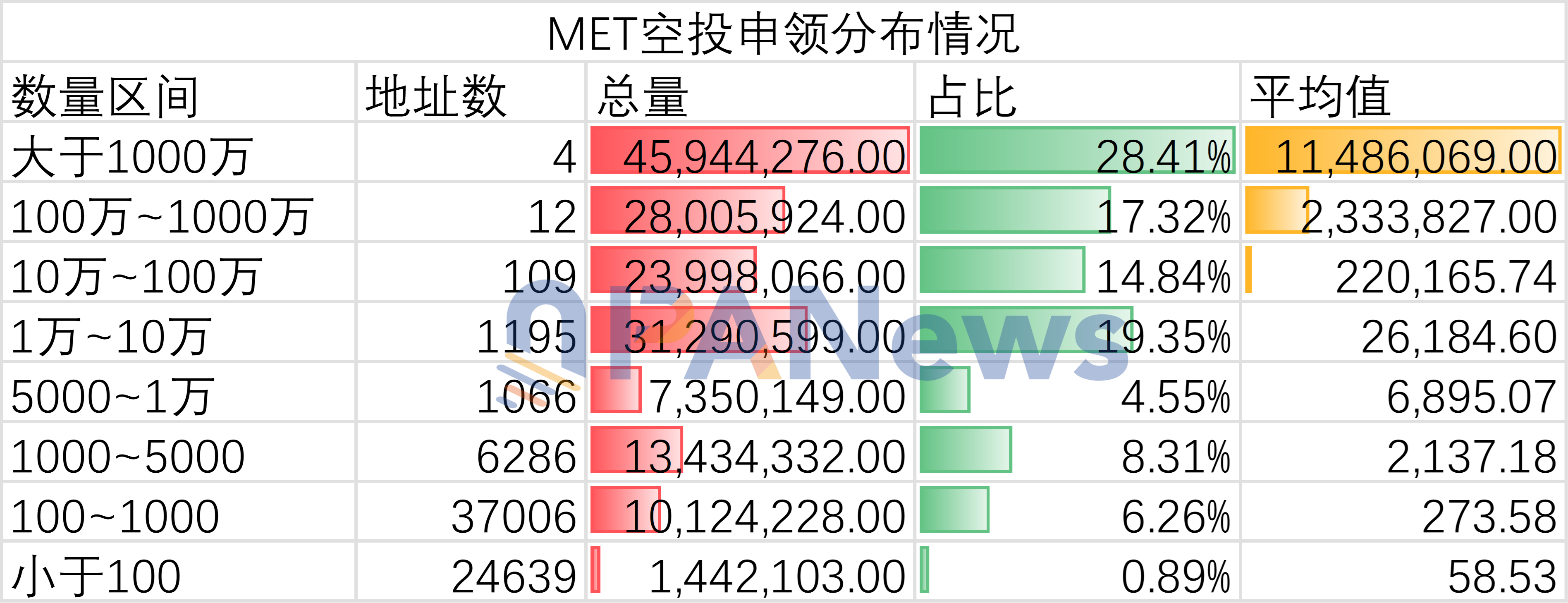 据 PANews 统计,截至 10 月 24 日,MET 空投已经发放的数量约为 1.61 亿枚,申领空投的交易笔数约为 7.1 万笔。平均每笔申领数量为 2277 枚代币。