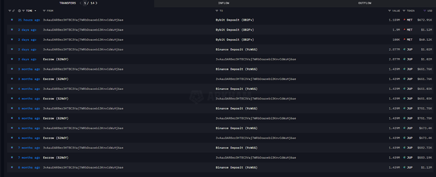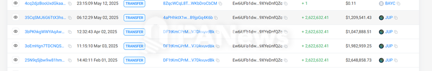 过去 8 个月,通过该地址抛售的 JUP 代币数量超过 3000 万枚。