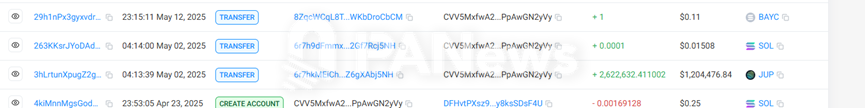 而领取数量排名第二和第三的地址则看起来具有极强的关联性。从简单的行为上来看,这两个地址都是 JUP 的大户,经常活跃在 Jupiter 流动池的添加当中。但巧合的是,这两个地址的 JUP 转账数量多次保持统一,都是 2,622,632.41 这个数量,且活动时间也常常是同一天。