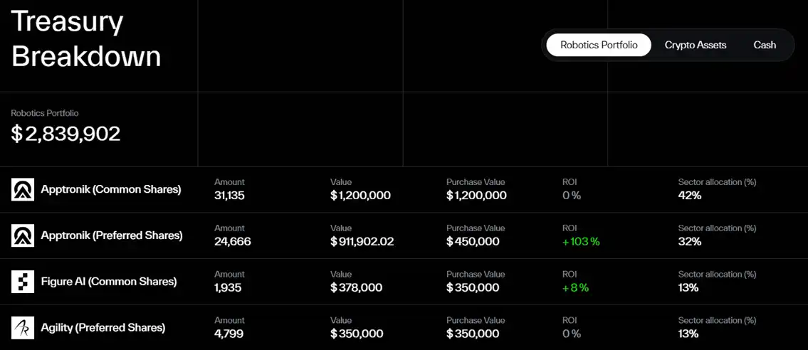 机器人投资 DAO。其治理代币 $DEUS 共计 3 轮的销售已经完成,共筹得了超过 550 万美元的加密资产。目前,该 DAO 已开始将拍卖所得用于支持 Apptronik、Figure AI 和 Agility Robotics 这三家公司都是人形机器人领域的企业。从官网的金库截图可以看到,DAO 的投资已经有开始实现获利,甚至单笔的回报率超过了 100%。