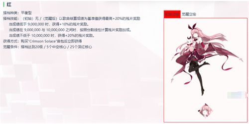 这个角色目前有各类形态的能力,不同形态当中她是有不同能力的,在基础的形态当中红姐姐是没有任何额外效果可以使用的,所以大家想要用她技能效果的话,这里需要将初始状态当中的红进行提升,达到了她觉醒状态之后就有,技能进行使用了,这里她在觉醒之后,可以使用的技能是以歌曲最后计算的成绩为基础的数值,那么这里她在获取的奖励上面最多是可以达到20%的残片提升奖励的,所以近期大家在需要各种残片进行消耗的时候,那么这个角色是大家上场的第一个选择,她初始的初Frag值有60,而达到满级的Frag值是有90的,所以中间还有30的区间需要大家去进行提升,所以红是可以通过角色碎片慢慢提升自己能力的角色,在这里红的可玩性在前期是有很多玩家喜欢的。