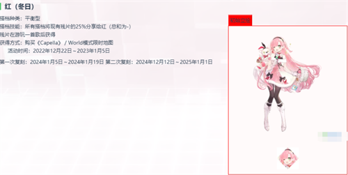 红在后期还有一个冬日形态,这个形态当中的红在基础的外观上面有了更多的变化,比如这里身上的裙子有了更多的绒边设计,也穿上了长靴,手中的小熊也改变了穿着,但是从整体的外观上面看白色元素增加以后,还是保留了大部分的红色设定,但是大部分裙子的颜色都变成了跟头发类似的粉红色,这个冬日形态的红其实是类似于皮肤的设定,除了外观之外,不会带来其他属性方面的数值变化。