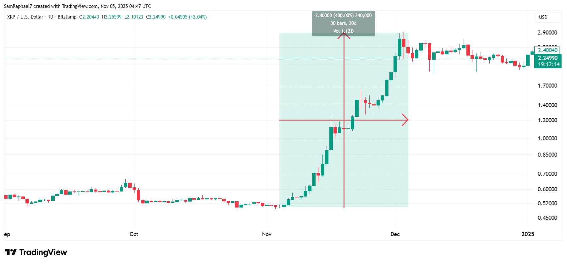 具体而言,在2024年11月4日唐纳德·特朗普胜选后,当时报价0.5美元的XRP借势飙涨。至2024年12月3日,XRP触及2.9美元峰值(创七年新高),短短一个月内惊人暴涨480%。