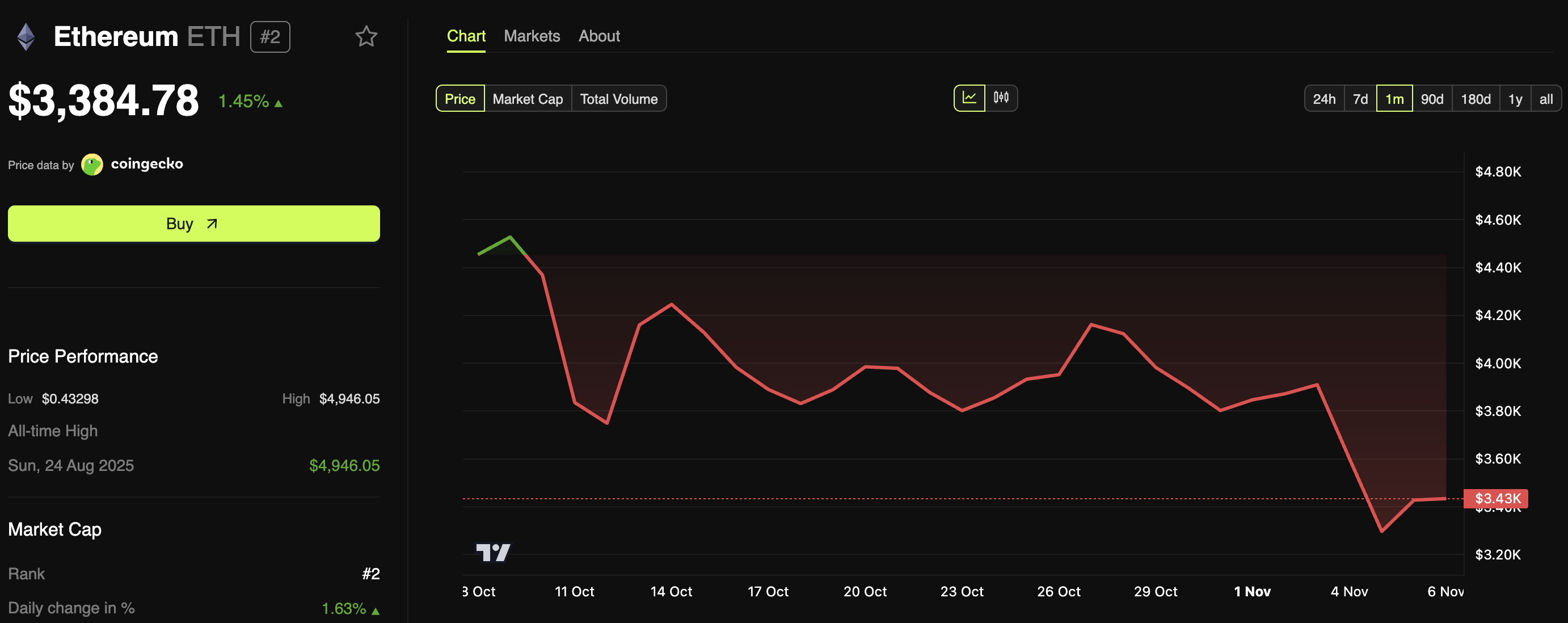 11月初,以太坊(ETH)价格暴跌超12%。然而,巨鲸们正在逢低买入——短短三天内豪掷13.7亿美元抄底这个市值第二大的加密货币。