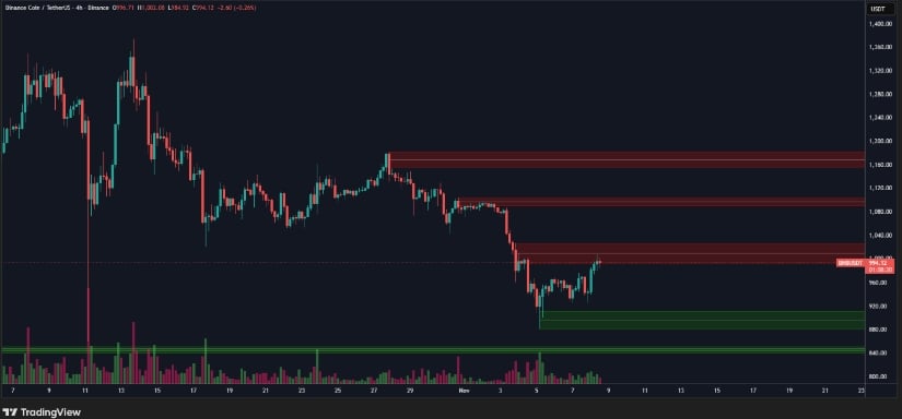 币安币自900美元区域反弹后重获上涨动能。分析师CW指出,下一个主要抛压位于1090美元附近,该价位曾多次阻碍此前涨势。根据CW的分析图表显示,1040至1160美元区间存在多重供应带,空头持续在这些区域施加卖压。