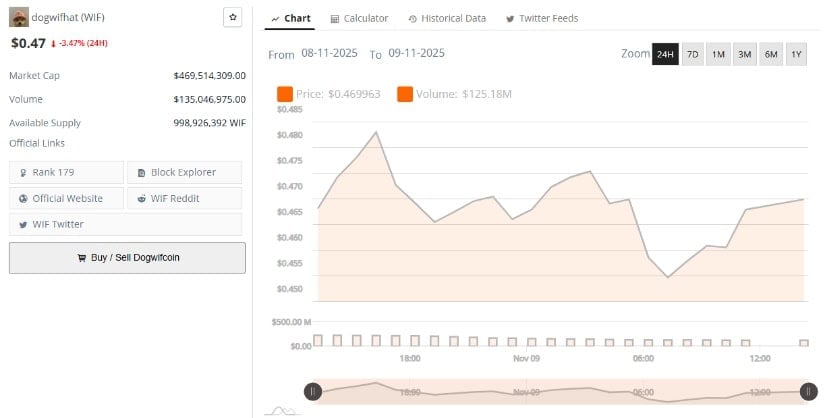 据BraveNewCoin数据,Dogwifhat现报0.47美元,24小时跌幅3.47%。市值约4.6951亿美元,日交易量1.3504亿美元。流通供应量9.989亿枚,全球加密货币排名第179位。