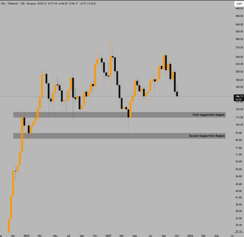 Solana回落测试关键中位需求区,价格徘徊在145-150美元支撑带上方考验买方力量。来源:ShangoTrades via X