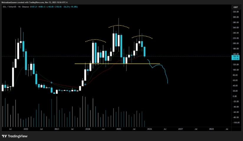 Solana宏观结构显现发展中的头肩顶形态,颈线位于120-125美元区间。来源:Nebraskangrooner via X