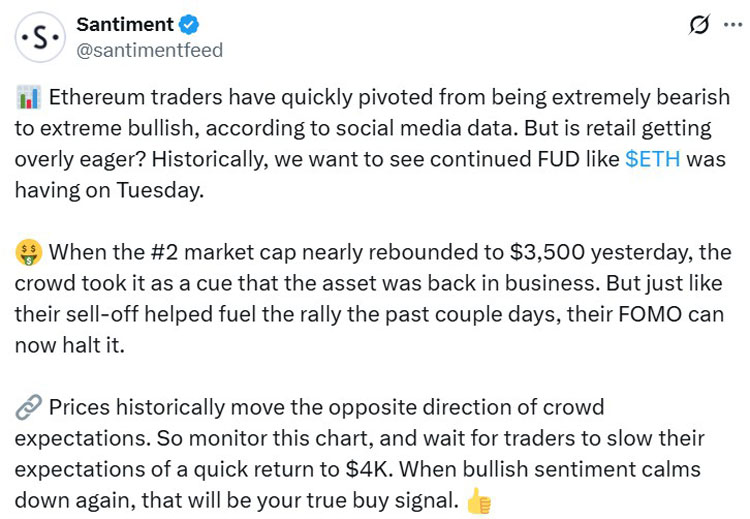 "以太坊交易者迅速从极度看跌转向极度看涨,"Santiment表示,并补充说当ETH"昨天几乎反弹至3500美元时,群众将其视为该资产重回正轨的信号。"
