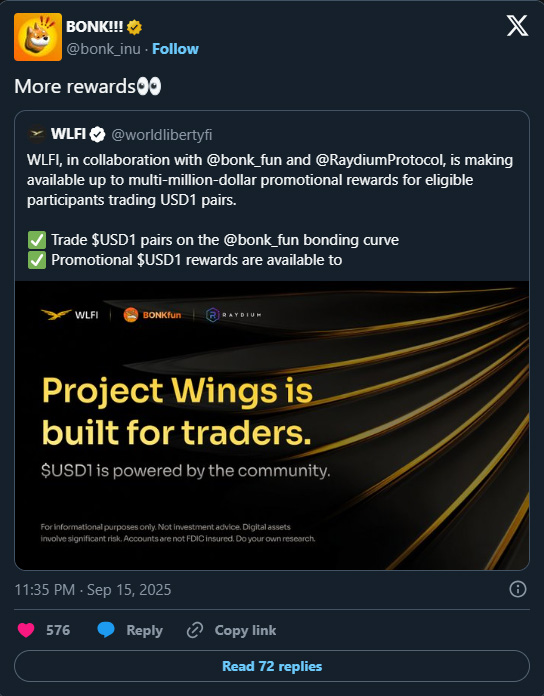 9 月15 日,BONK 成为强化Solana DeFi 生态系统更广泛计划的一部分。由川普支持的World Liberty Financial(WLFI) 与Bonk.fun 及Raydium 合作推出了Project Wings。该计划为在Bonk.fun 上交易USD1 稳定币交易对引入推广奖励,旨在推动稳定币采用并加深Solana 的流动性。