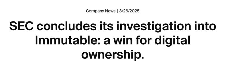 2025 年初,SEC 宣布结束对 Immutable 的调查,并不会采取任何执法行动,Immutable 共同创办人暨总裁 Robbie Ferguson 表示:“我们很高兴 SEC 结束这项调查,这不只是 Immutable 的胜利,更是整个加密货币产业与游戏界迈向监管明朗化的重要里程碑。”