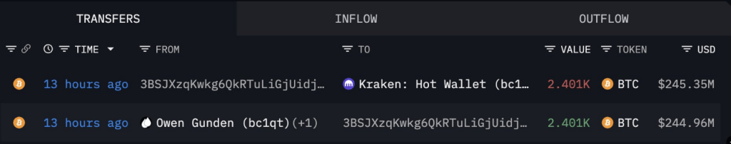报告显示,与交易员Owen Gunden关联的钱包向Kraken交易所转移了2400枚比特币(约合2.37亿美元),该笔转账被区块链监测机构Arkham追踪。