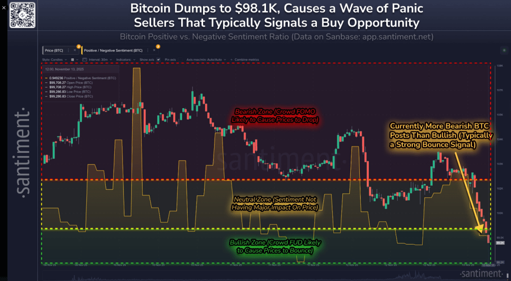 Santiment数据显示,比特币本月第二次跌破10万美元关口,引发散户交易员恐慌情绪蔓延。