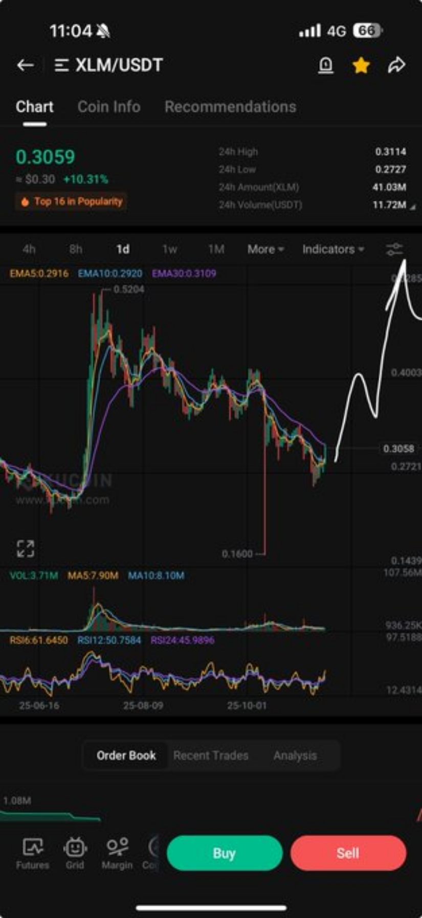 加密货币分析师@PROGWORX对XLM/USDT提出了看涨预测,指出该代币在近期回调后可能正在形成多阶段复苏结构。其图表分析强调,XLM或在0.30美元附近进行短期盘整,随后向上突破,推动价格在未来交易时段冲击0.38-0.40美元区间。